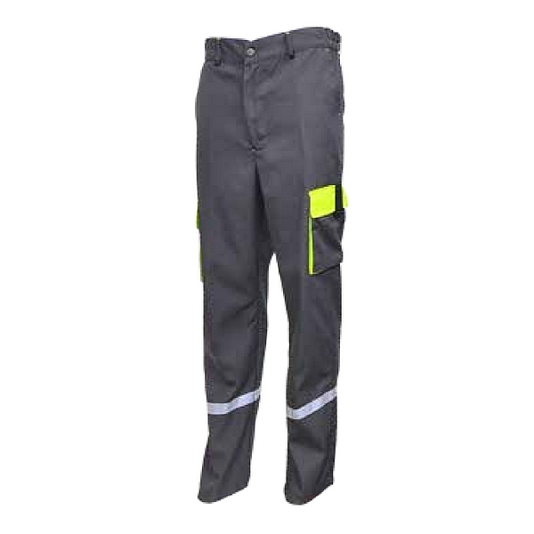 Taille semi-élastiquée, braguette fermeture à glissière, 2 poches italiennes, 1 poche arrière, 1 poche cuisse avec soufflets fermée par rabat, bandes réfléchissantes 3M Scotchlite™ de 2,5 cm de largeur.