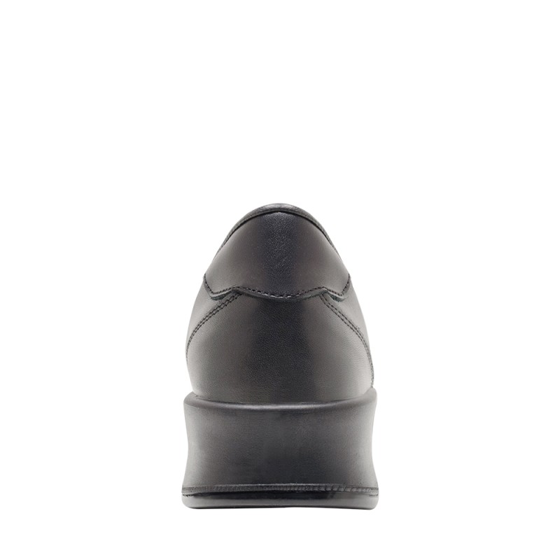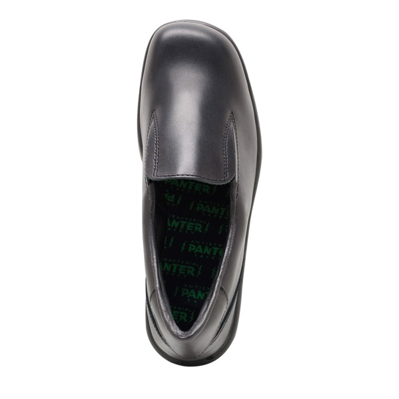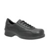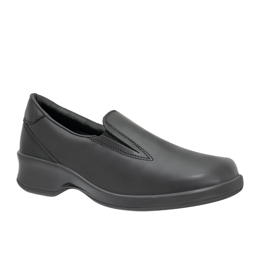 Chaussure de sécurité noire pour femme, type mocassin, fabriquée en cuir naturel pleine fleur, très doux au toucher. Design ergonomique adapté à l’anatomie du pied féminin. Antifatigue, elle est recommandée pour les personnes passant leur journée debout. Idéale comme chaussure professionnelle, formelle, pour un usage urbain, au bureau ou comme uniforme.